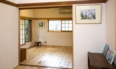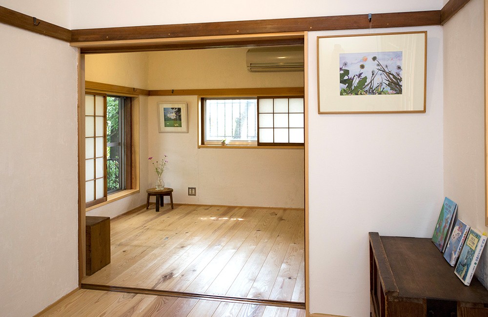 静かな住宅街の一角。大きな桜の木が目印。四季折々の変化のある生垣と、小さな庭のあるギャラリーです。ここちよい尾鷲香杉の床と漆喰塗りの壁でできています。作品の展示やイベントスペースとしてお貸しします。